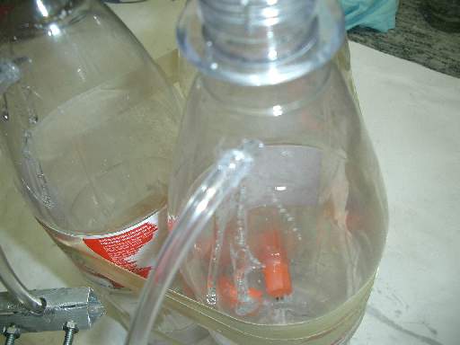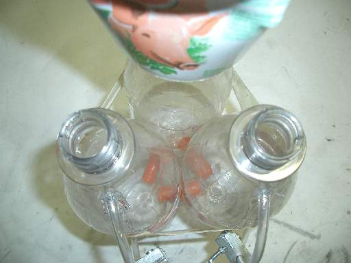 | Schläuche In einer der Flaschen sammelt sich Wasserstoffgas in einer zweiten Sauerstoffgas. Ein Schlauch führt aus den Gasenthaltenden Flaschen hinaus um das Gas abzulassen. Damit das Gas abgelassen werden kann wann ich will habe ich Ventile an die Schläuche gemacht. |